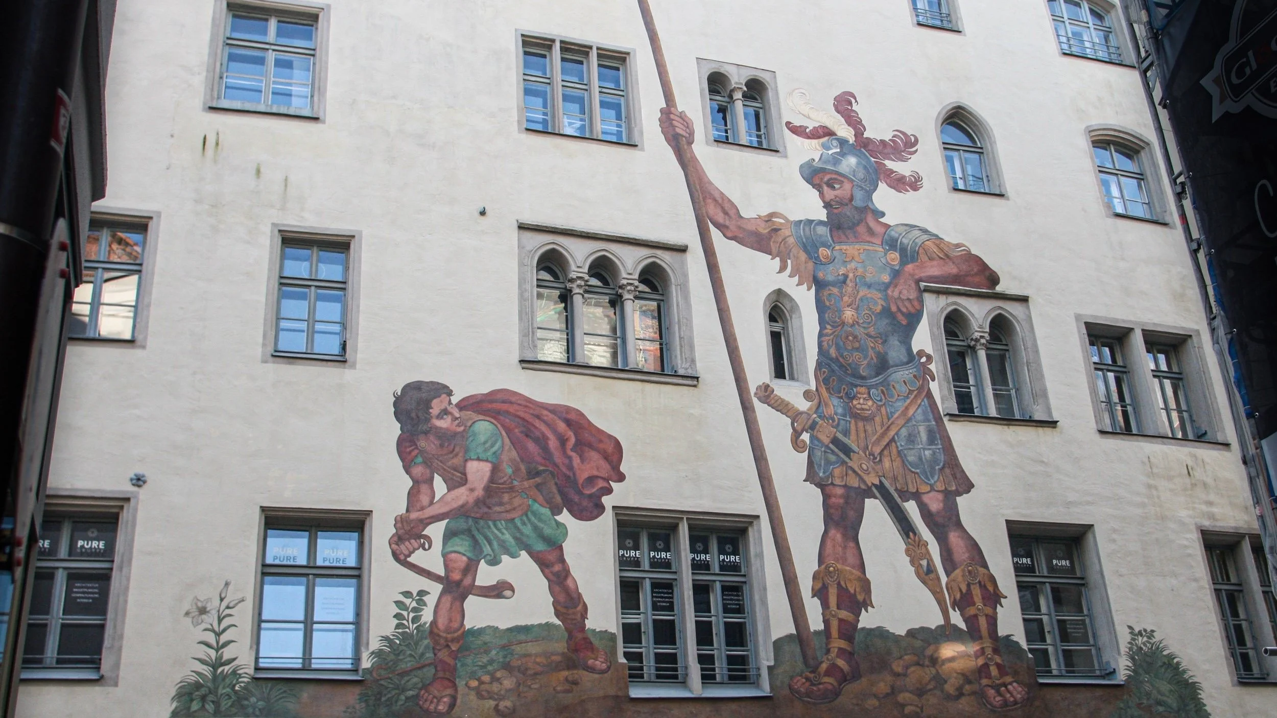 Regelmäßig komme ich in meiner Wahlheimatstadt Regensburg am Goliathhaus vorbei. Darauf prangt ein monumentales Fresko, ursprünglich wohl 1573 von einem reichen Kaufmann in Auftrag gegeben. Etliche Restaurationen soll es in den vergangenen Jahrhunderten bereits erfahren haben, was der eindrücklichen Wirkung aber keineswegs geschadet hat.