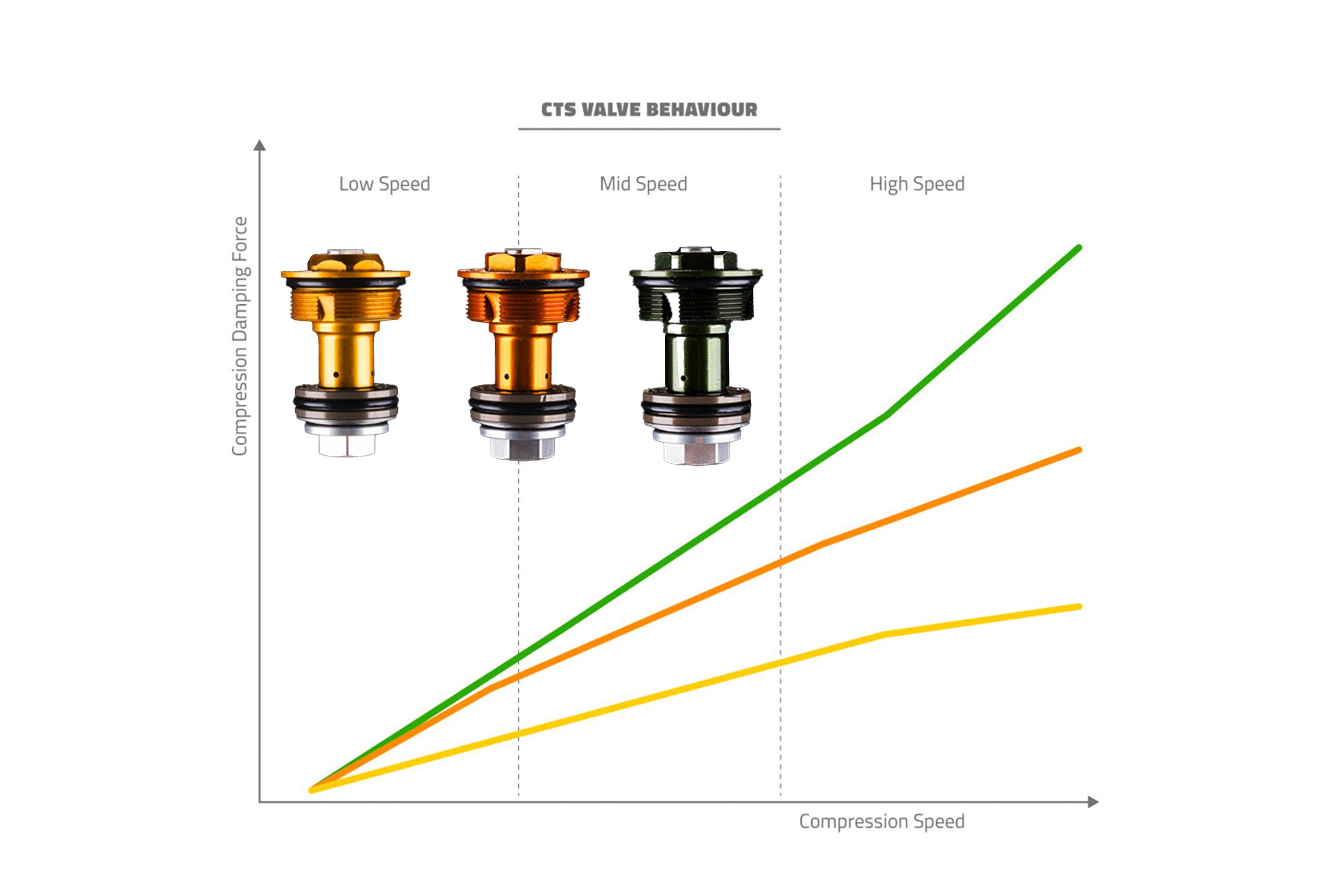 Je schneller die Geschwindigkeit des Schafts, desto höher wird der Öldruck und die auftretende Kraft auf die Bohrungen und Shims. Schaut man sich jetzt die unterschiedlichen CTS-Kennlinien (im nächsten Abschnitt zu sehen) an, kann man erahnen, wie sich die einzelnen CTS-Ventile bei welcher Schaftgeschwindigkeit verhalten. Die Bohrungen und Shims werden je nach auftretender Kraft schneller, langsamer oder auch gar nicht überwunden und bieten dadurch eben weniger oder mehr Dämpfung. Durch diese Anpassungen kann die Kennlinie individuell gewählt werden.