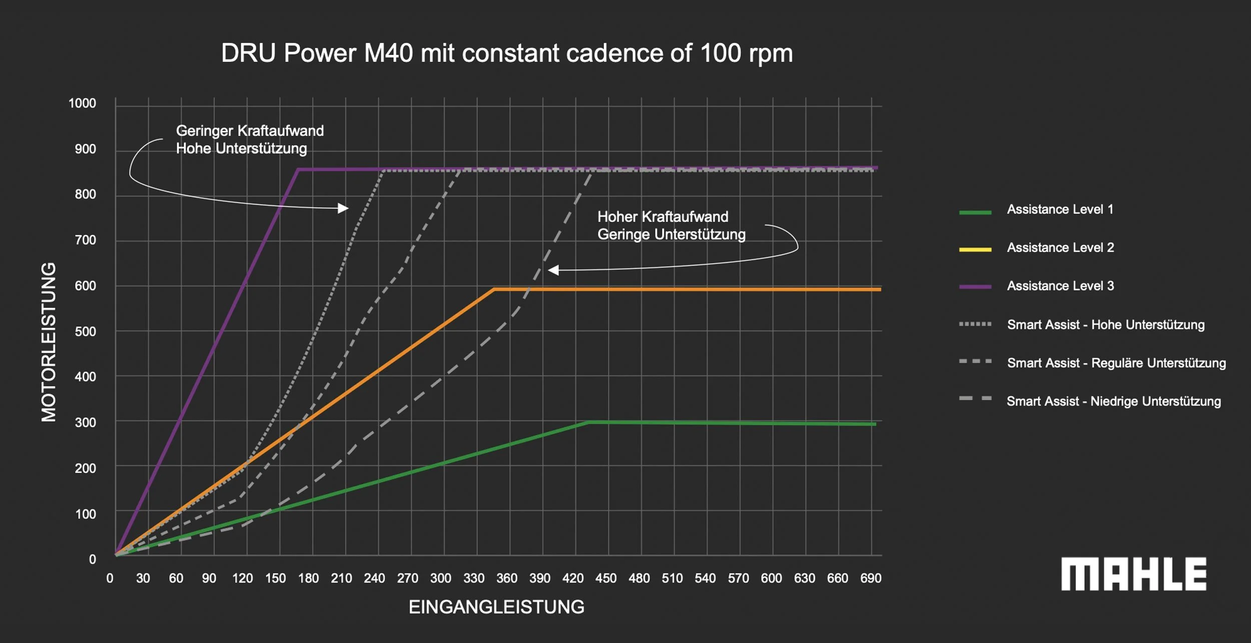 Entscheidend für das Gefühl ist die Wahl des Kraft-Inputs durch den Fahrer, über den die Spitzenleistung getriggert wird. In den Motor Maps (über die MySmartBike-App oder das Display konfigurierbar) lässt sich einstellen, ob die volle Power eher bei hoher Fahrerleistung (für fitte Fahrer, die selbst stark reintreten) oder bereits bei geringerer Eigenleistung (für mehr Unterstützung) abgerufen wird. Die dazugehörige Grafik zeigt, wie sich die Motorleistung dynamisch an die Fahrerleistung anpasst – je nach gewählter Charakteristik (Hohe, reguläre oder niedrige Unterstützung).