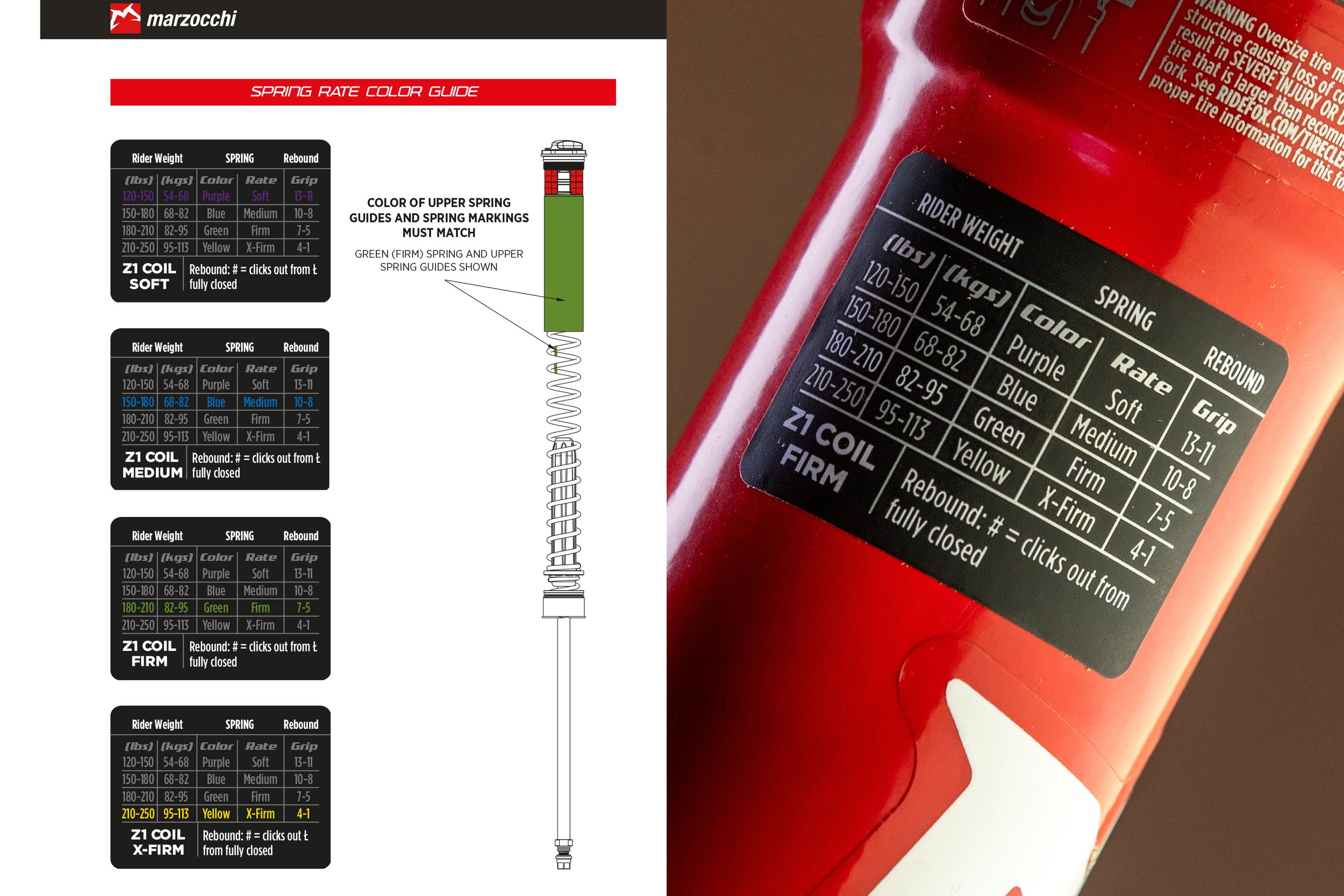 If you prefer a firmer or softer feel, or if you simply want a different ride feel than what comes with the standard spring, you can gain access via the top cap on the left side of the Z1. Beneath it sits the spring, enclosed in a color-coded plastic sleeve designed to minimize rattling. Here's what the exploded view and the instructions from the manufacturer look like: