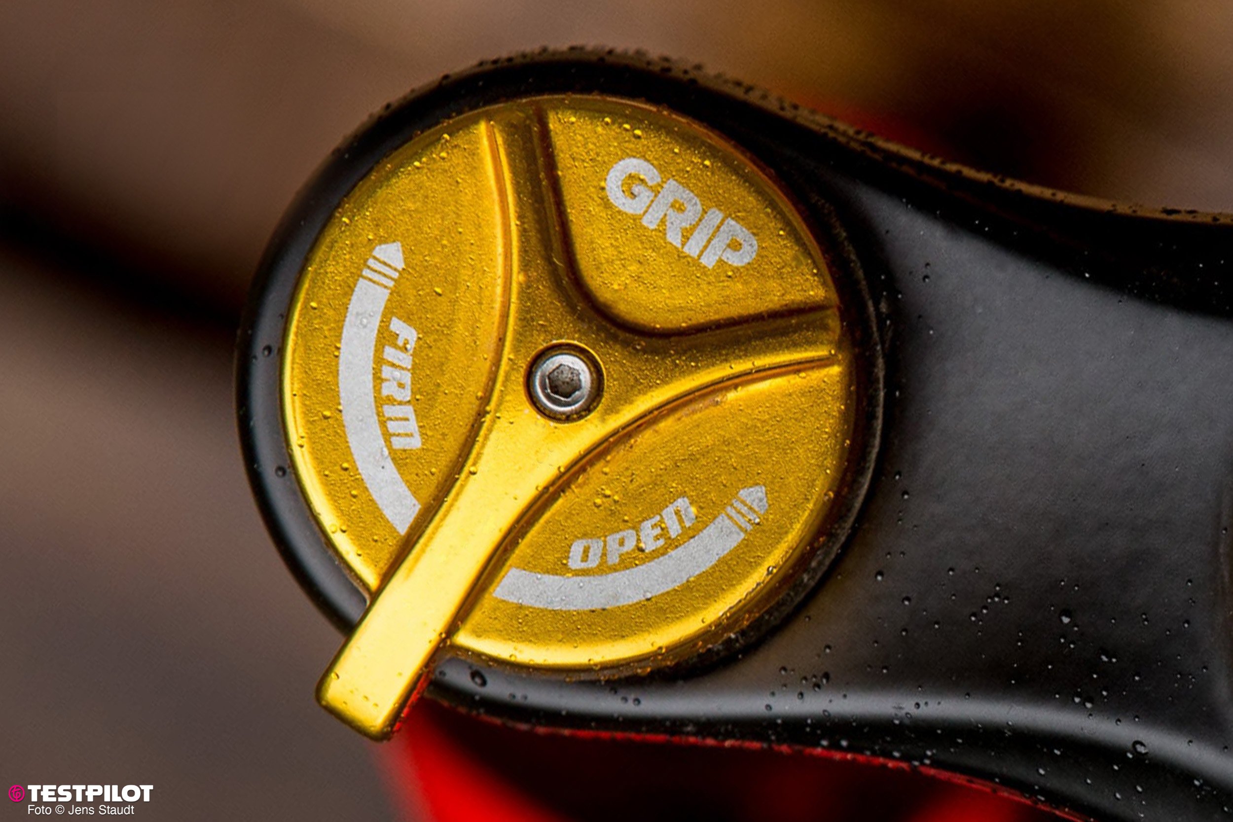 If you prefer to ride with maximum support, reach for the golden "volume knob"—the GRIP compression adjuster. Since it's stepless, you might feel a bit unsure at first about where you are in the adjustment range, but you quickly get used to it.