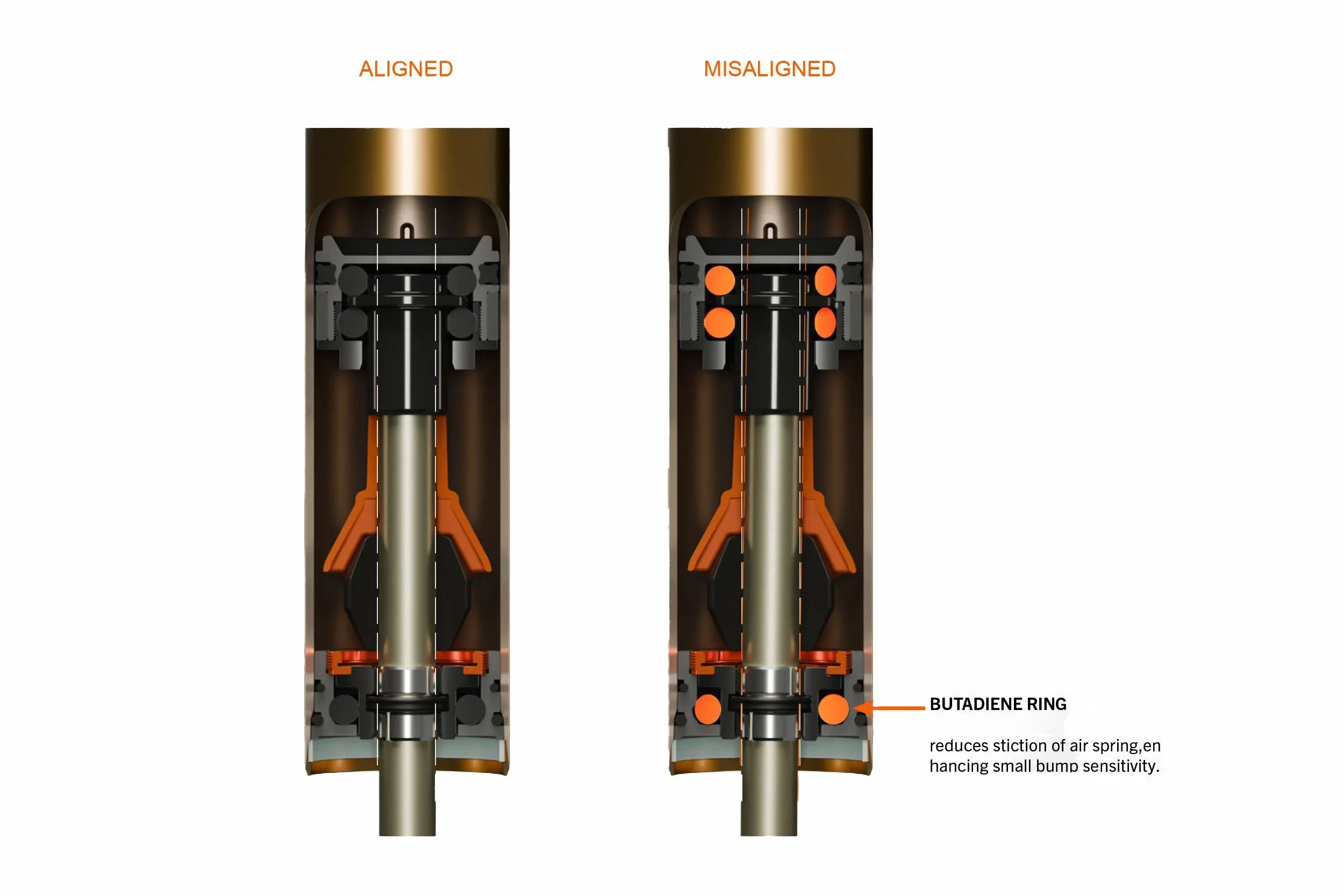 Die markierten Butadien-O-Ringe ermöglichen eine vertikale und laterale Nachgiebigkeit des Luftkolbens.