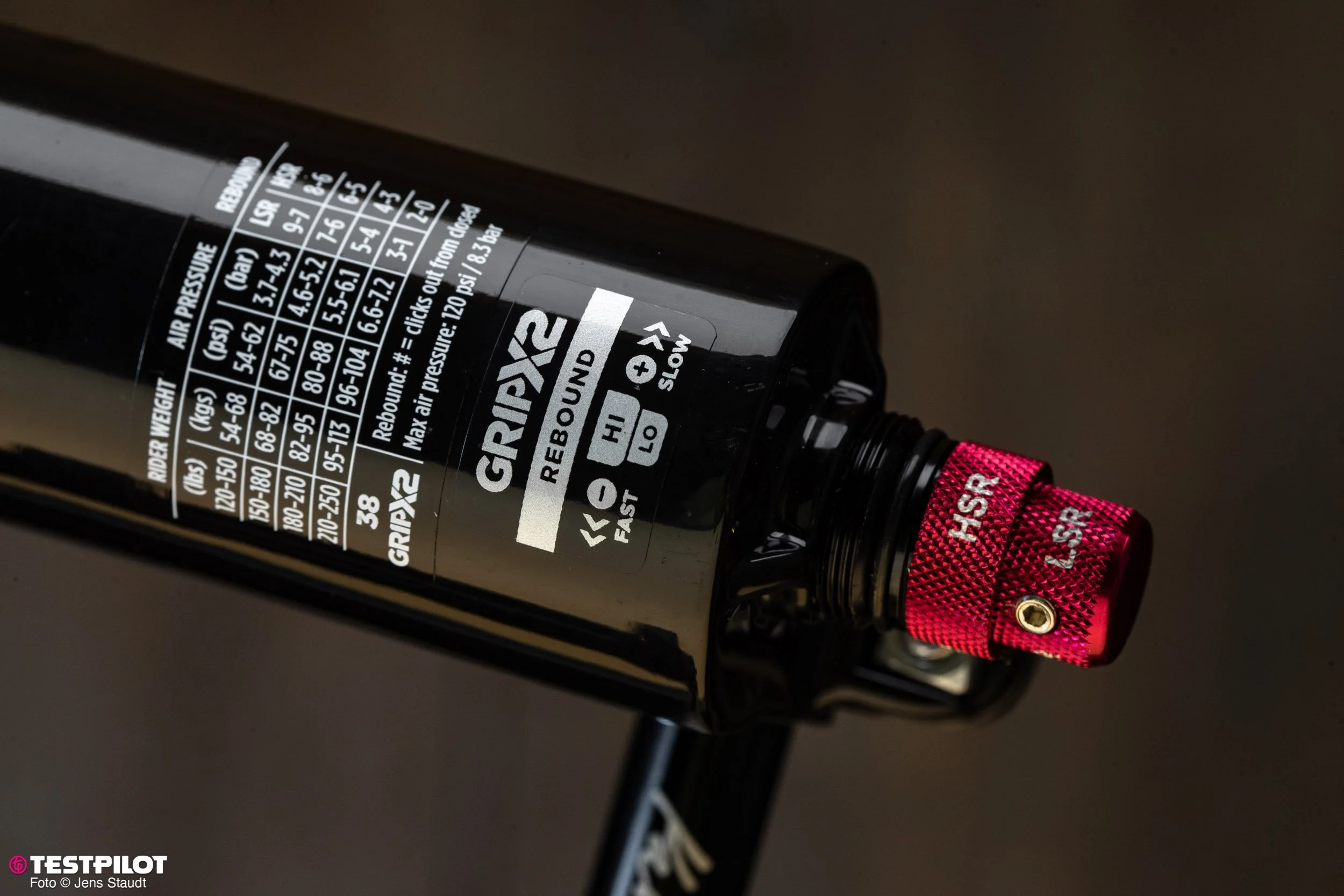 Luftdruck- und Rebound-Startwerte in Abhängigkeit vom Fahrergewicht findet man auf der Rückseite des rechten Gabelbeins.