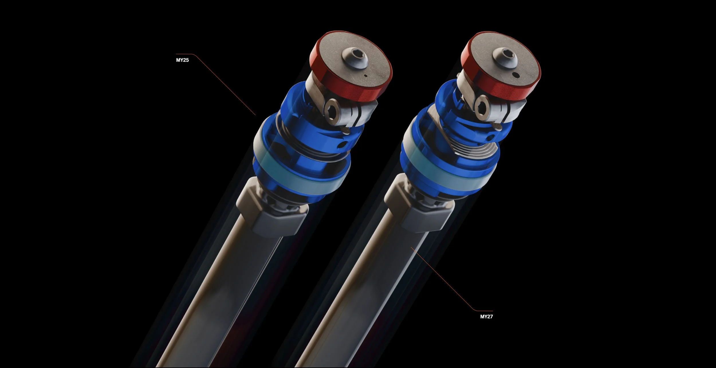 Gut zu erkennen: Bei MY27 ist ein größeres Loch (Port) zu sehen, das mehr Öl in den Kolben lässt. Die blauen Ventile haben ein neues Design und die Shims dazwischen sind nicht mehr rund, sondern seitlich abgeschnitten.