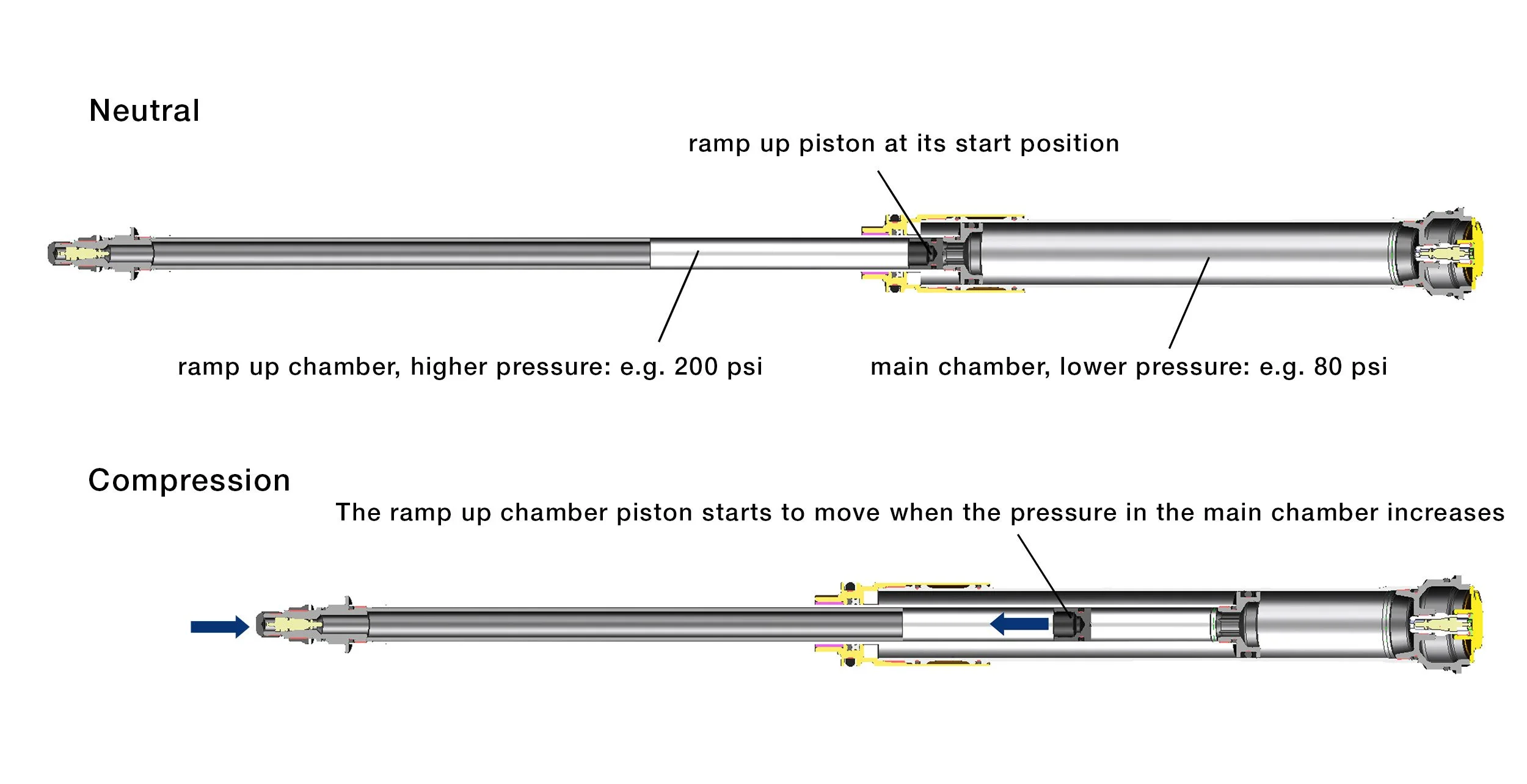 The third chamber, the ramp-up chamber, offers significantly more tuning range compared to other manufacturers who rely solely on plastic spacers to reduce the main chamber volume and increase progression. It has its own valve located on the left underside of the RXF38. The ramp-up chamber operates at a significantly higher pressure than the main chamber. As pressure in the main chamber increases, the ramp-up piston begins to move. The more air you put in here, the stronger the progression becomes throughout the travel.