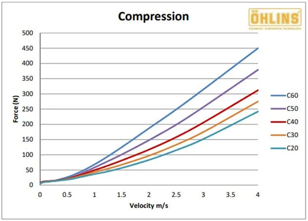 High-speed compression is controlled by a special valve with an Öhlins patent, a design not used by many other manufacturers. Low-speed compression remains effective across its adjustment range between the three HSC positions. In practice, you can roughly say that turning out LSC by five clicks is comparable to turning in HSC by one click. For most riders, starting with HSC at one click (clockwise) is a good baseline. Due to the large steps of the high-speed compression adjuster, finding a good balance with the rear suspension is easy.
