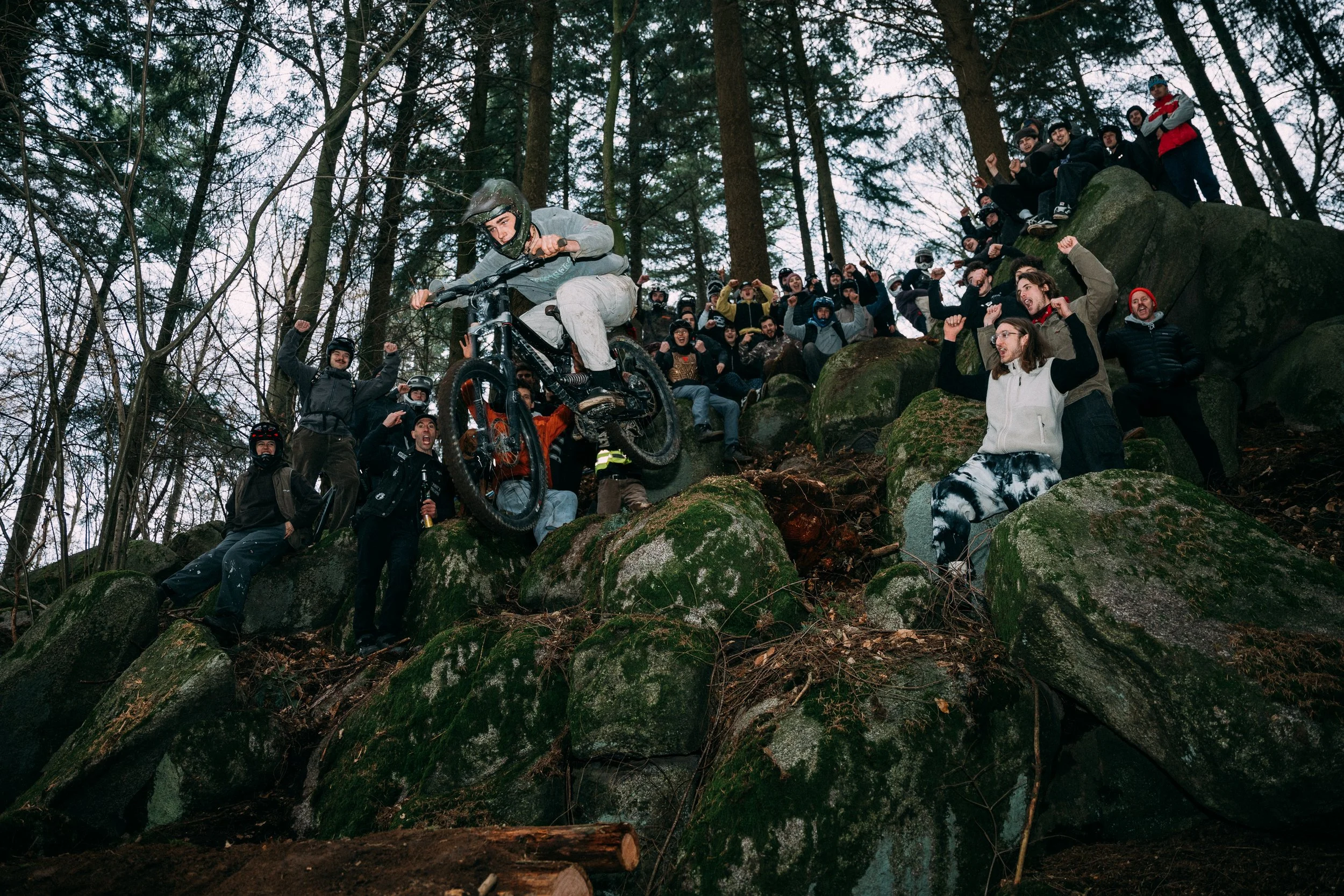 Zurück in der Heimat, war die Gelegenheit günstig. Lukas, der inzwischen in Innsbruck lebt, war zu Besuch. Gemeinsam standen sie an einem Hang, umgeben von Granitsteinen. „Lass uns Skinnies bauen, provisorische Landings hochziehen und gucken, dass wir so viele Jungs wie möglich an den Start bekommen.“ Die Idee war simpel: kein Wettkampf, keine Jury, einfach nur fahren, kreativ sein, Spaß haben. „Ich dachte, im Worst Case werden wir vielleicht 10, 15 Leute“, sagt Marten. „Im Best Case vielleicht 25, 30.“ Es wurden 68. Plus Leon. 69.