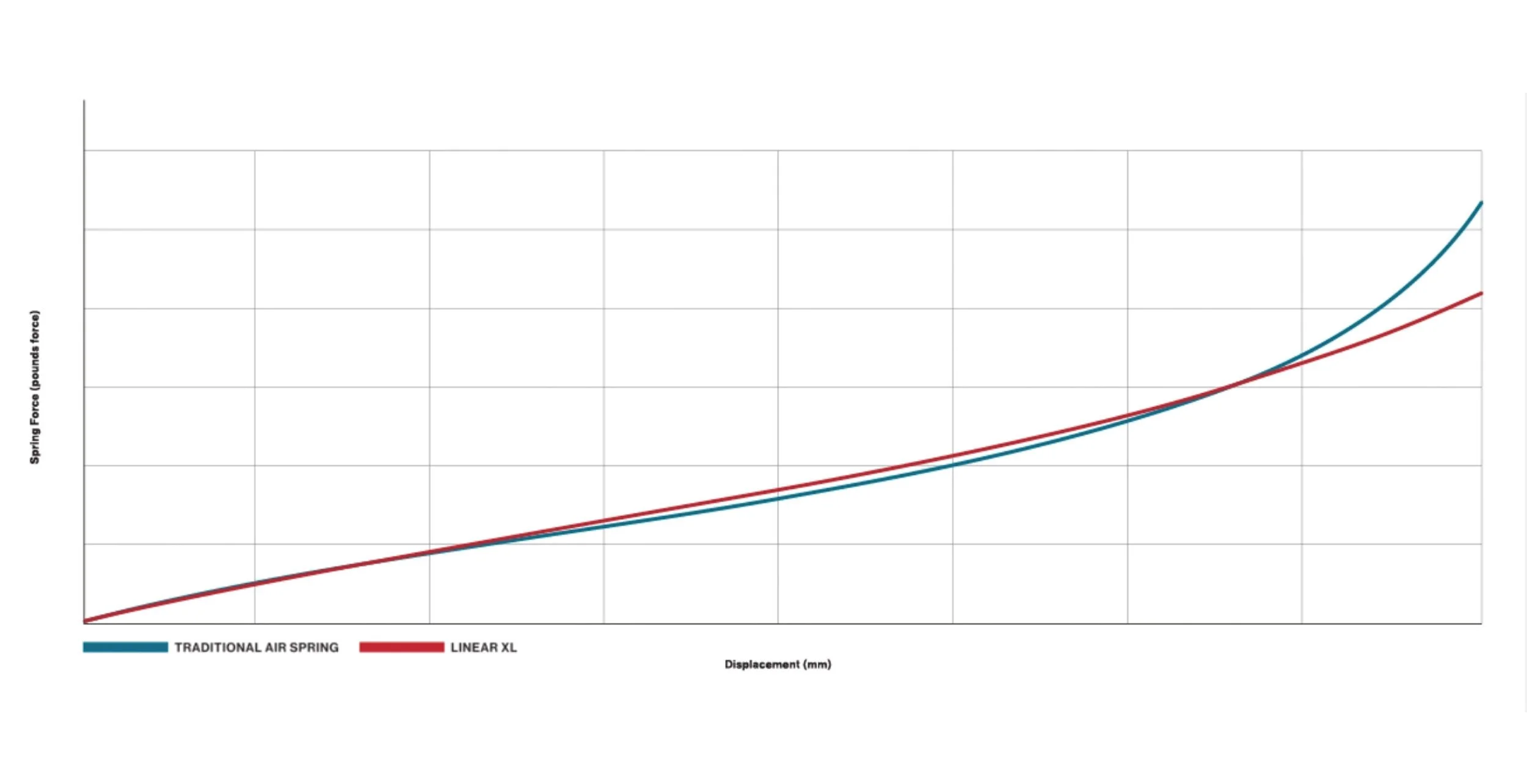 LinerXL-Luftfeder-Kennlinie: Schwer zu sehen, aber auf den ersten Millimetern liegt die Kurve minimal unterhalb der vorherigen, danach läuft sie deutlich linearer als bei den Vorgängermodellen.