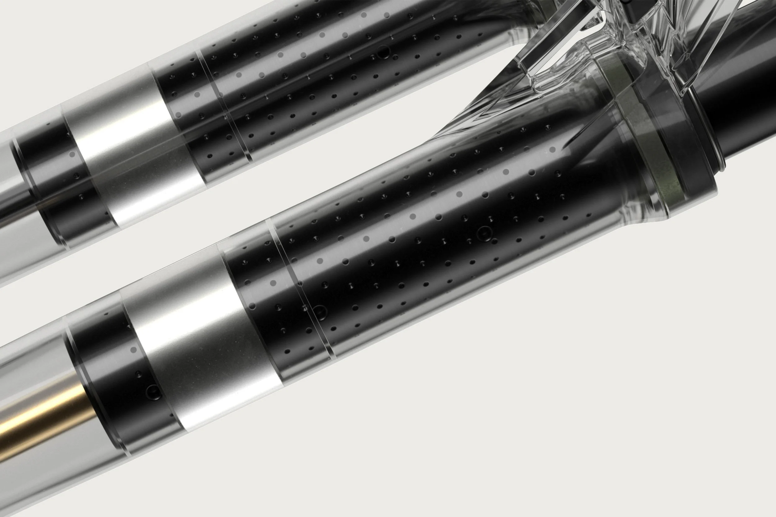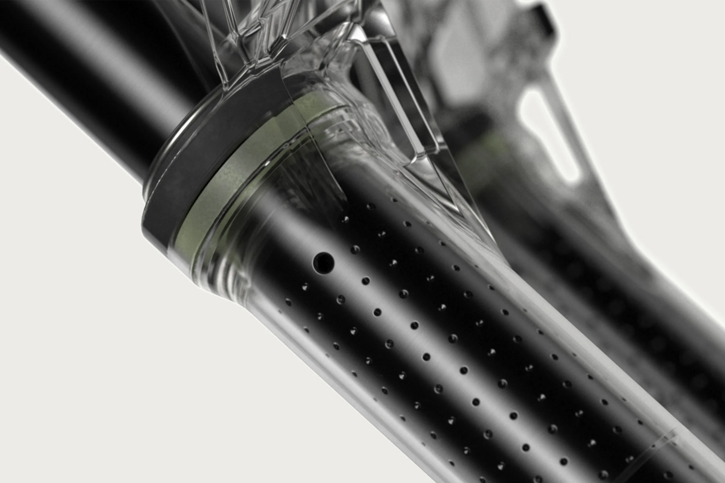 Atemlöcher in den Standrohren: Strategisch positionierte Öffnungen gleichen den Luftdruck zwischen den Tauchrohren und dem übrigen Chassis aus. Das reduziert den Ramp-Up-Effekt, der entsteht, wenn die Luft am Ende des Federwegs komprimiert wird.