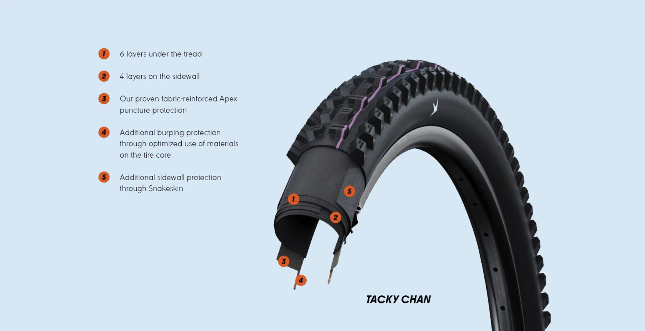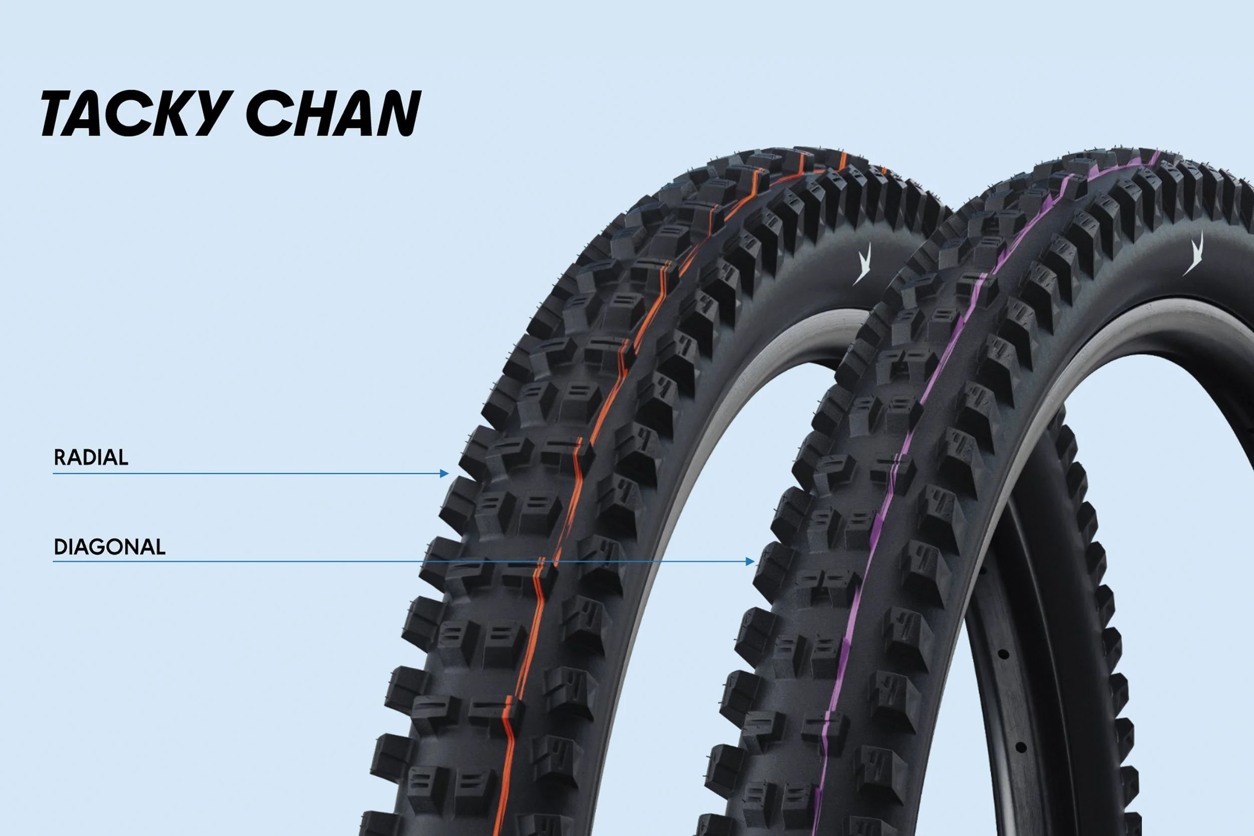 Bisher war der Tacky Chan ausschließlich als Diagonalreifen erhältlich. Jetzt gibt es ihn auch radial. Er soll der schnellste Downhill-Reifen im Sortiment sein – daher eignet er sich hervorragend am Hinterrad. Im klassischen diagonalen Sektor bleibt er uns erhalten und verdrängt die Big Betty. Als Radialreifen feiert er sogar eine exklusive Premiere: Die 2,5″-Breite wird es nur in dieser Bauart geben. Für die speziellen Anforderungen und die höhere Verformung der Radial-Lauffläche hat Schwalbe das Profil des Tacky Chan optimiert. Die neue 2-2 Aufteilung der Profilblöcke sorgt für ein kontrollierteres Fahrverhalten. Der geschlossenere Übergangsbereich soll ein sanfteres Einlenken und erhöhte Bremstraktion bieten.