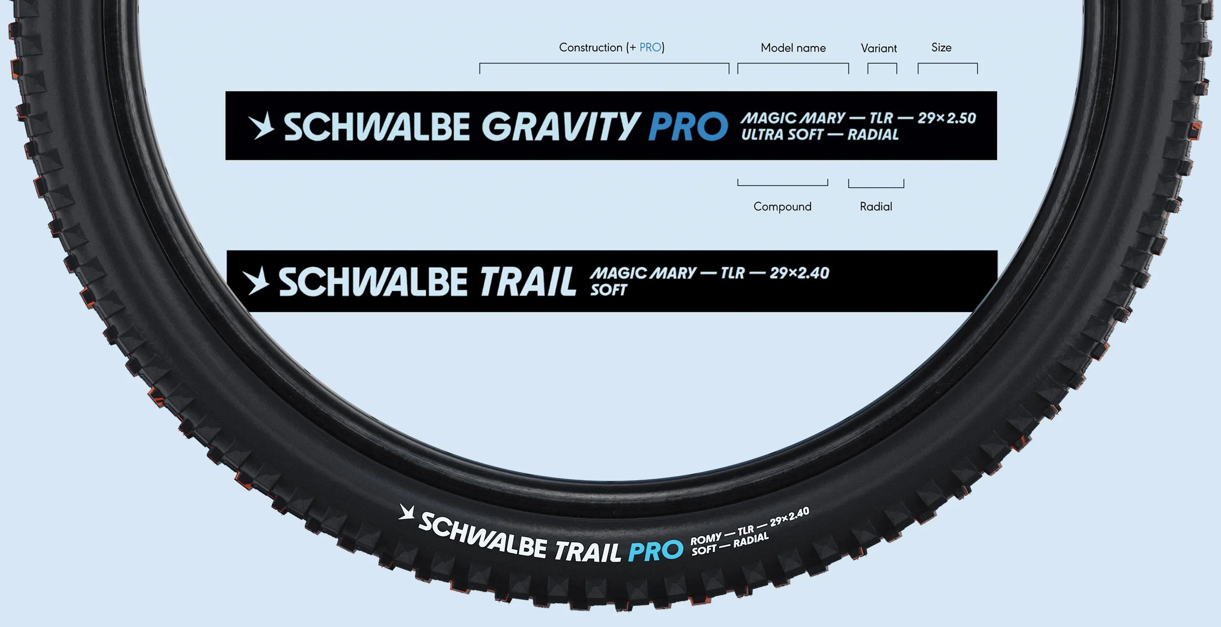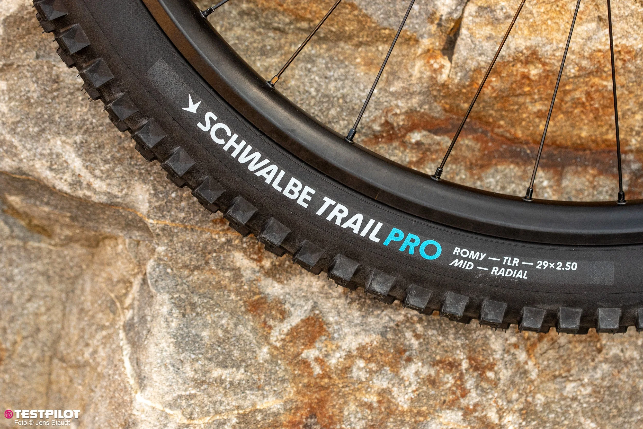Mit all diesen Änderungen passt Schwalbe auch die Beschriftung auf der Seitenflanke des Reifens an. Das neue Design ähnelt optisch zwar dem der alten Radialreifen, ist im Detail jedoch anders. Auf der Flanke steht nun nicht mehr das Modell im Vordergrund, sondern die entsprechende Familie – zum Beispiel: SCHWALBE TRAIL oder eben SCHWALBE TRAIL PRO. Das Modell befindet sich jetzt im „Kleingedruckten“ und unterstreicht die Philosophie, dass man seinen Reifen zuerst nach dem Einsatzzweck und erst dann nach dem Profil aussucht.
